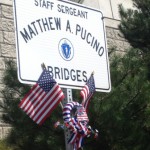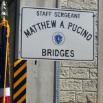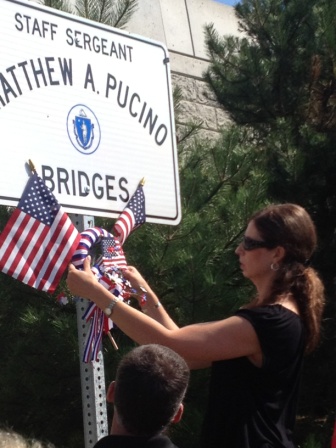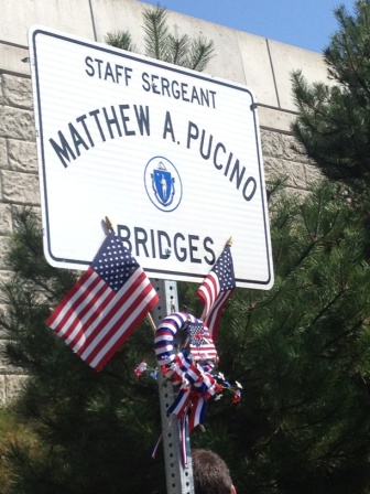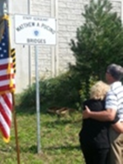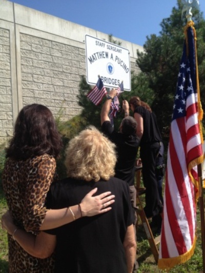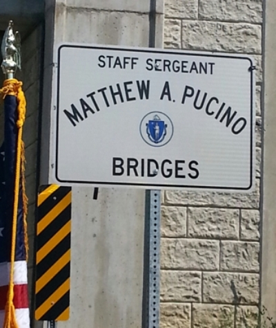 SSG Pucino Bridge Dedication Melissa Pucino Speaking on sign dedication SSG Matthew A. Pucino Bridge Sign Dedication Matthew’s sign is complete Lisa Pucino Haglof Melissa & Kathy Pucino Kathy & Al Pucino looking on